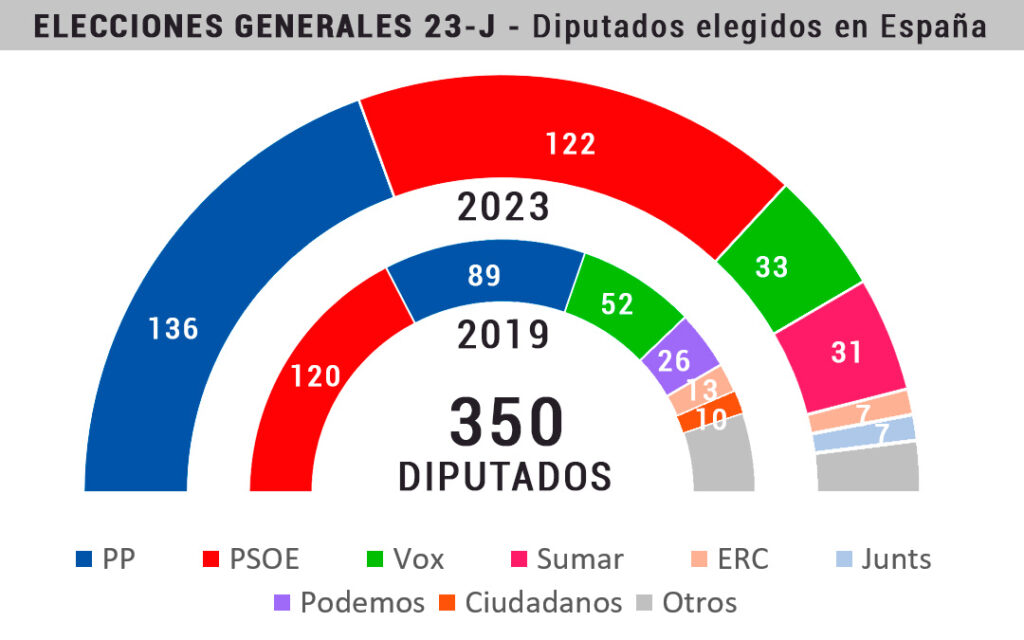El Partido Socialista Obrero Español (PSOE), liderado por Pedro Sánchez, ha obtenido el mayor número de escaños, pero no cuenta con la mayoría necesaria para gobernar en solitario. Por su parte, el Partido Popular (PP), que gobernó España durante los últimos años, ha sufrido una significativa pérdida de apoyo electoral.